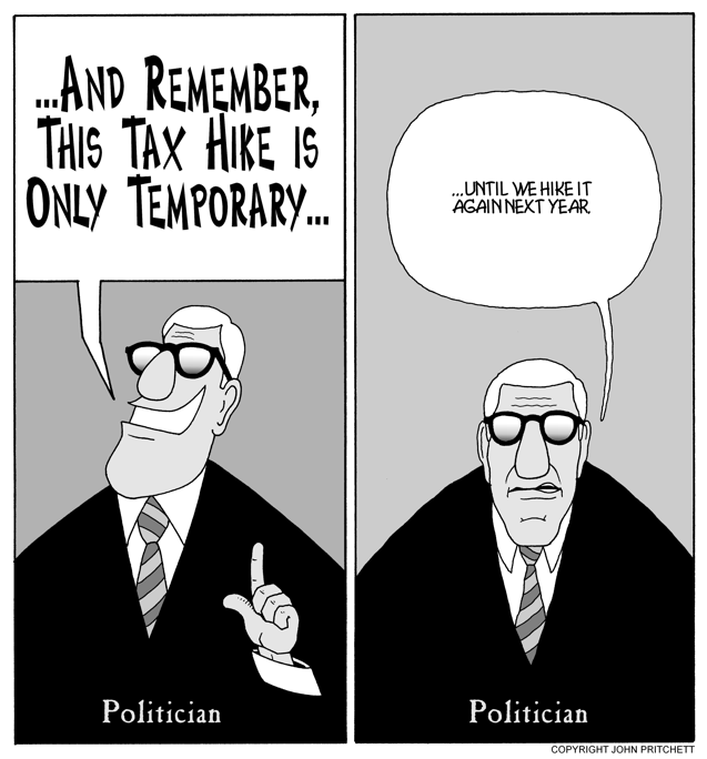 Honolulu Weekly 6-8-05 Remember this tax hike is only temporary... Next Cartoon | Previous Cartoon | 2005 | Archives | Home | Search