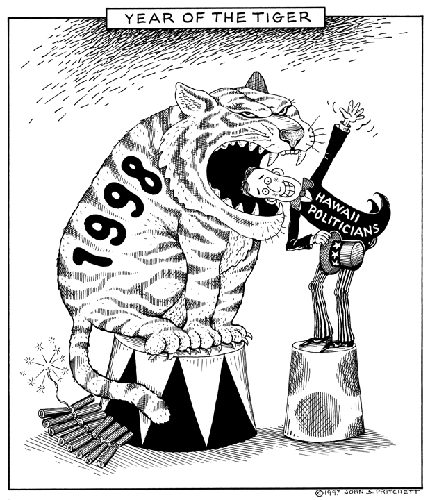 Honolulu Weekly 12-31-97 1998 is the Year of the Tiger and Hawaii Elections Next Cartoon | Previous Cartoon | 1997 | Archives | Home | Search