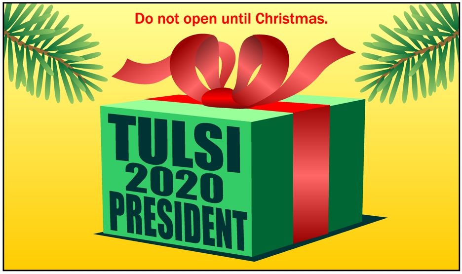 Tulsi Gabbard for President in 2020 Christmas Surprise. Pritchett Cartoon for MidWeek November 14, 2018 | To comment, Email Pritchett Next Cartoon | Previous Cartoon | MidWeek Pritchett Cartoon Archive | Home Page