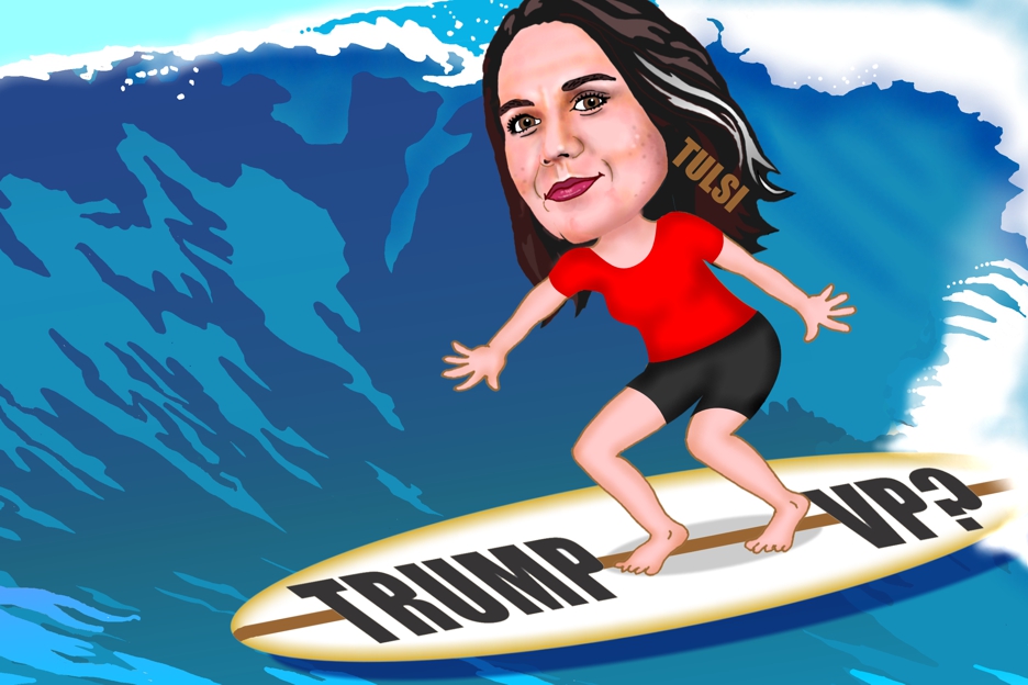 Tulsi Gabbard on short list for Trump VP. Pritchett Cartoon for Honolulu Civil Beat, February 25, 2024 | To comment, Email Pritchett Next Cartoon | Previous Cartoon | Civil Beat Pritchett Cartoon Archives | Home Page
