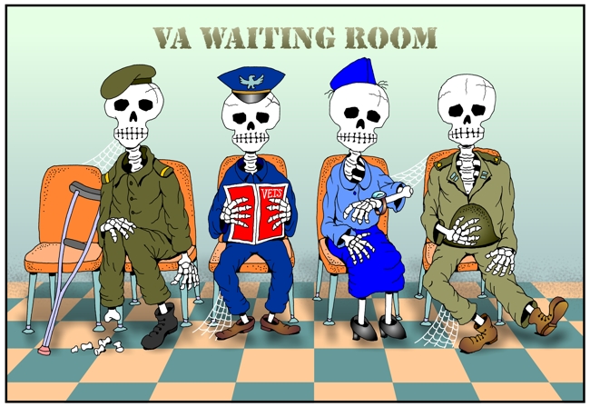 VA waiting room - Veterans wait for medical care . Pritchett Cartoon for MidWeek, June 11, 2014 | To comment, Email Pritchett Next Cartoon | Previous Cartoon | MidWeek Pritchett Cartoon Archive | Home Page | Search