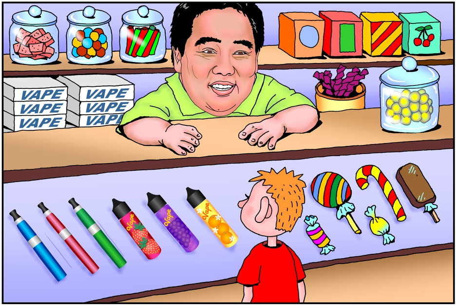 Vaping products target children. Pritchett Cartoon for Honolulu Civil Beat, March 20, 2022 | To comment, Email Pritchett Next Cartoon | Previous Cartoon | Civil Beat Pritchett Cartoon Archives | Home Page