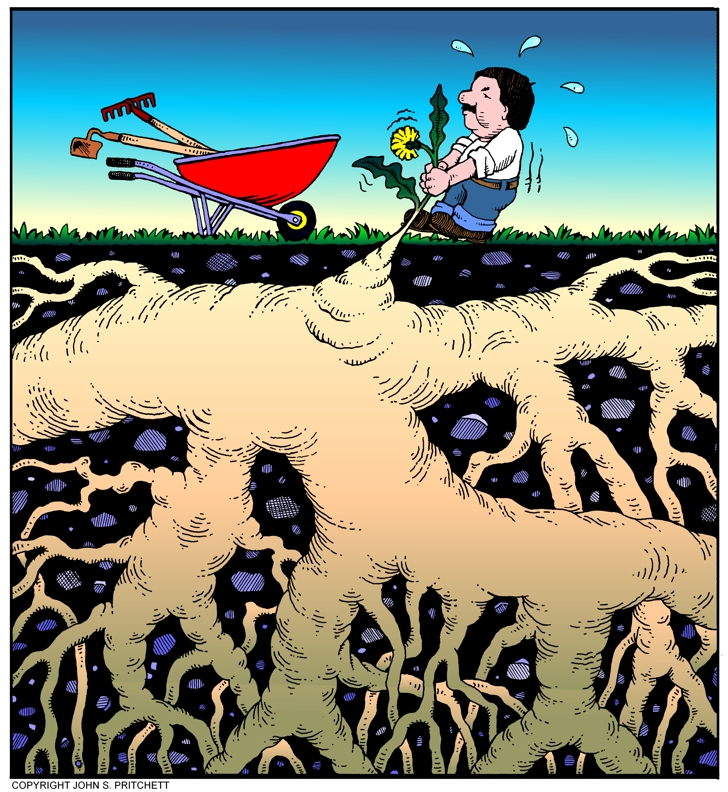 Pulling the last weed. Be sure you get the roots or it'll grow back. For details on usage or to purchase original artwork, Email Pritchett Cartoon Archives | Site Map | Home Page | Search